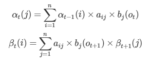 알파를 전방확률, 베타를 후방확률이라고 부르는데, 후방확률은 이후에 설명할 예정이니 생략하고, 우리가 위에 구현한 Foward Algorithm의 점화식은 알파의 저것과 일치한다.